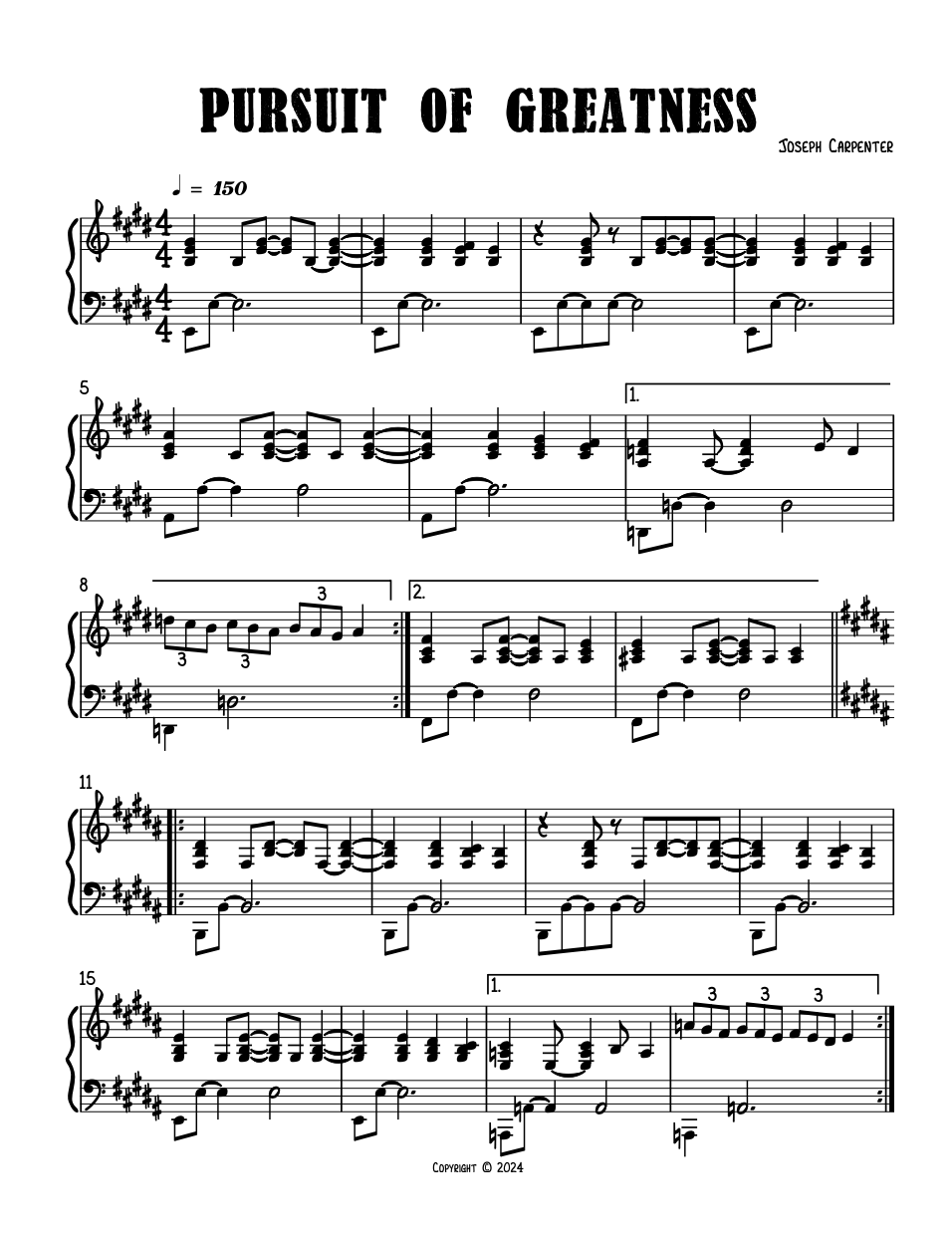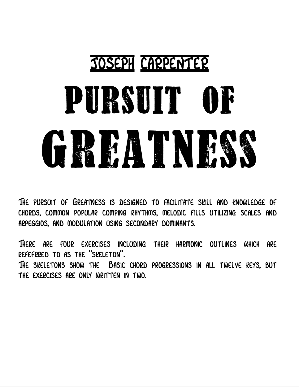 The Pursuit of Greatness is designed to facilitate skill and knowledge of chords, common popular comping rhythms, melodic fills utilizing scales and arpeggios, and modulation using secondary dominants.