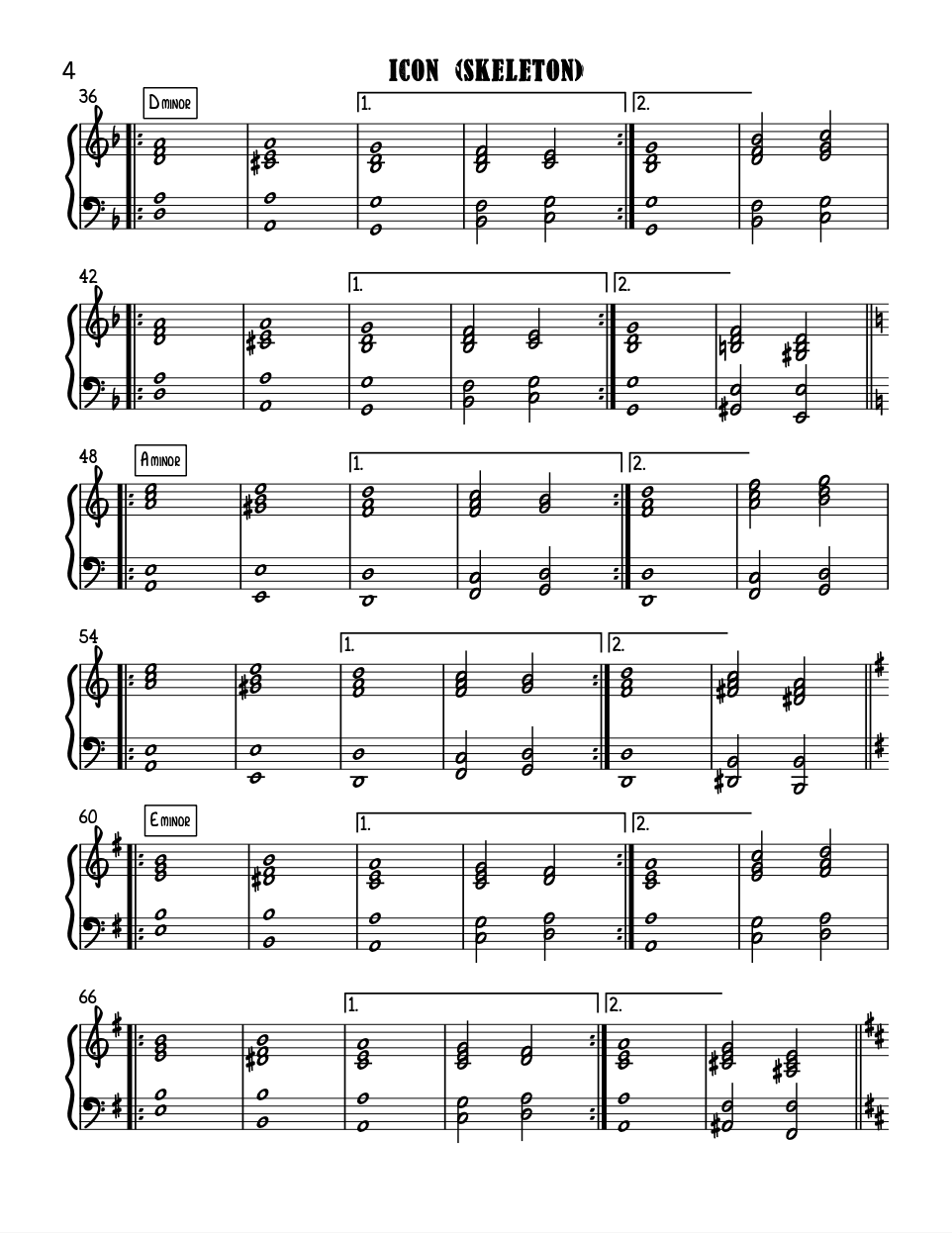 There are four exercises including their harmonic outlines which are referred to as the "skeleton". The skeletons show the basic chord progressions in all twelve keys, but the exercises are only written in two.